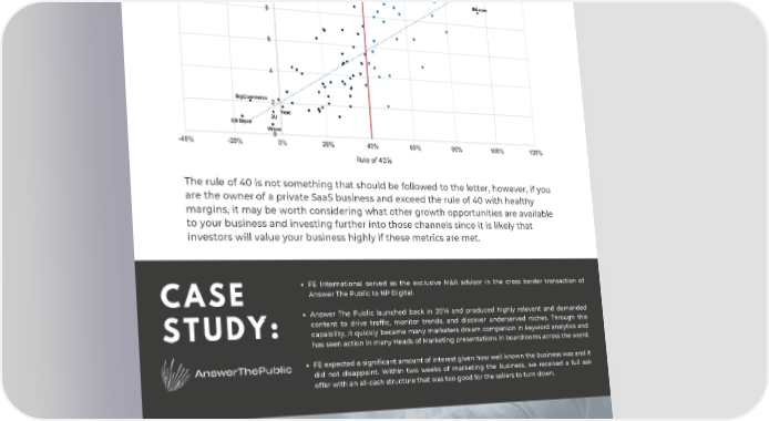 EV / Forward Revenue Yext Rule of 40% The rule of 40 is not something that should be followed to the letter, however, if you are the owner of a private SaaS business and exceed the rule of 40 with healthy margins, it may be worth considering what other growth opportunities are available to your business and investing further into those channels since it is likely that investors will value your business highly if these metrics are met. FE International served as the exclusive M&A advisor in the cross border transaction of Answer The Public to NP Digital. CASE Answer The Public launched back in 2014 and produced highly relevant and demanded content to drive traffic, monitor trends, and discover underserved niches. Through this capability, it quickly became many marketers dream companion in keyword analytics and STUDY: has seen action in many Heads of Marketing presentations in boardrooms across the world. FE expected a significant amount of interest given how well known the business was and it did not disappoint. Within two weeks of marketing the business, we received a full ask offer with an all-cash structure that was too good for the sellers to turn down. FE INTERNATIONAL PAGE 12