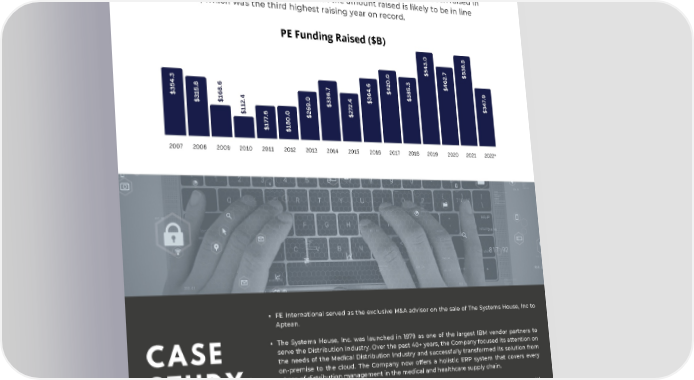 VC AND PE FUNDRAISING FOR SAAS Pitchbook data up to September 2022 indicates that $348 billion has been raised in PE funding in 2022. This would mean that the amount raised is likely to be in line with 2020, which was the third highest raising year on record. PE Funding Raised ($B) $538.5 $543.0 $462.7 $420.0 $385.3 $364.6 $354.3 $347.9 $336.7 $168.6 $315.8 $272.4 $112.4 $269.0 $177.6 $180.0 2007 2008 2009 2010 2011 2012 2013 2014 2015 2016 2017 2018 2019 2020 2021 2022* FE International served as the exclusive M&A advisor on the sale of The Systems House, Inc to Aptean. The Systems House, Inc. was launched in 1979 as one of the largest IBM vendor partners to serve the Distribution Industry. Over the past 40+ years, the Company focused its attention on CASE the needs of the Medical Distribution Industry and successfully transformed its solution from on-premise to the cloud. The Company now offers a holistic ERP system that covers every phase of distribution management in the medical and healthcare supply chain. STUDY: The Seller had previously tried to sell the Company in 2021 and was in conversations with several North American vertical software acquirers. No deal was struck and the Seller engaged FE International in early 2022 to conduct a formal M&A process. As part of the M&A process, FE International reached out to institutional and strategic buyers, executed dozens of NDAs, and received 13 IOIs in the first round of bidding. FE International invited six bidders back for a second/final round of bidding and an LOI was executed with Aptean. The deal FE International secured represents a 122% price improvement when compared to the initial bids submitted by the buyers that the Seller brought to the table. FE INTERNATIONAL PAGE 07